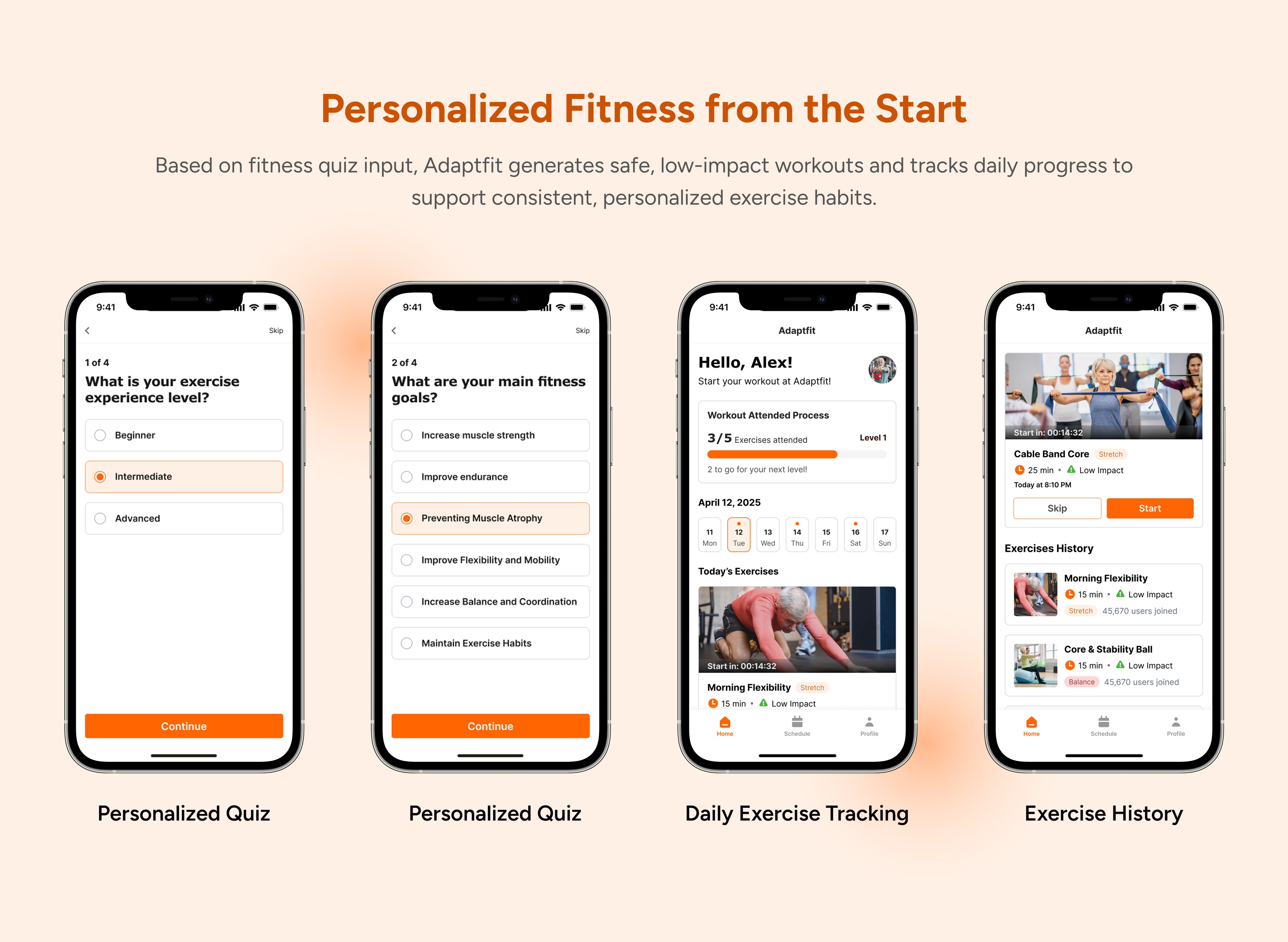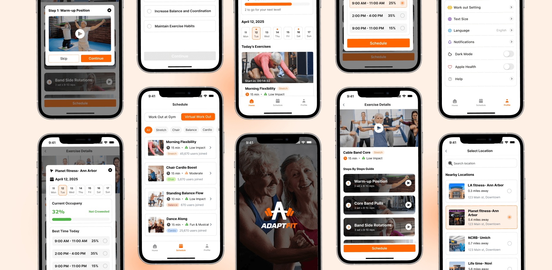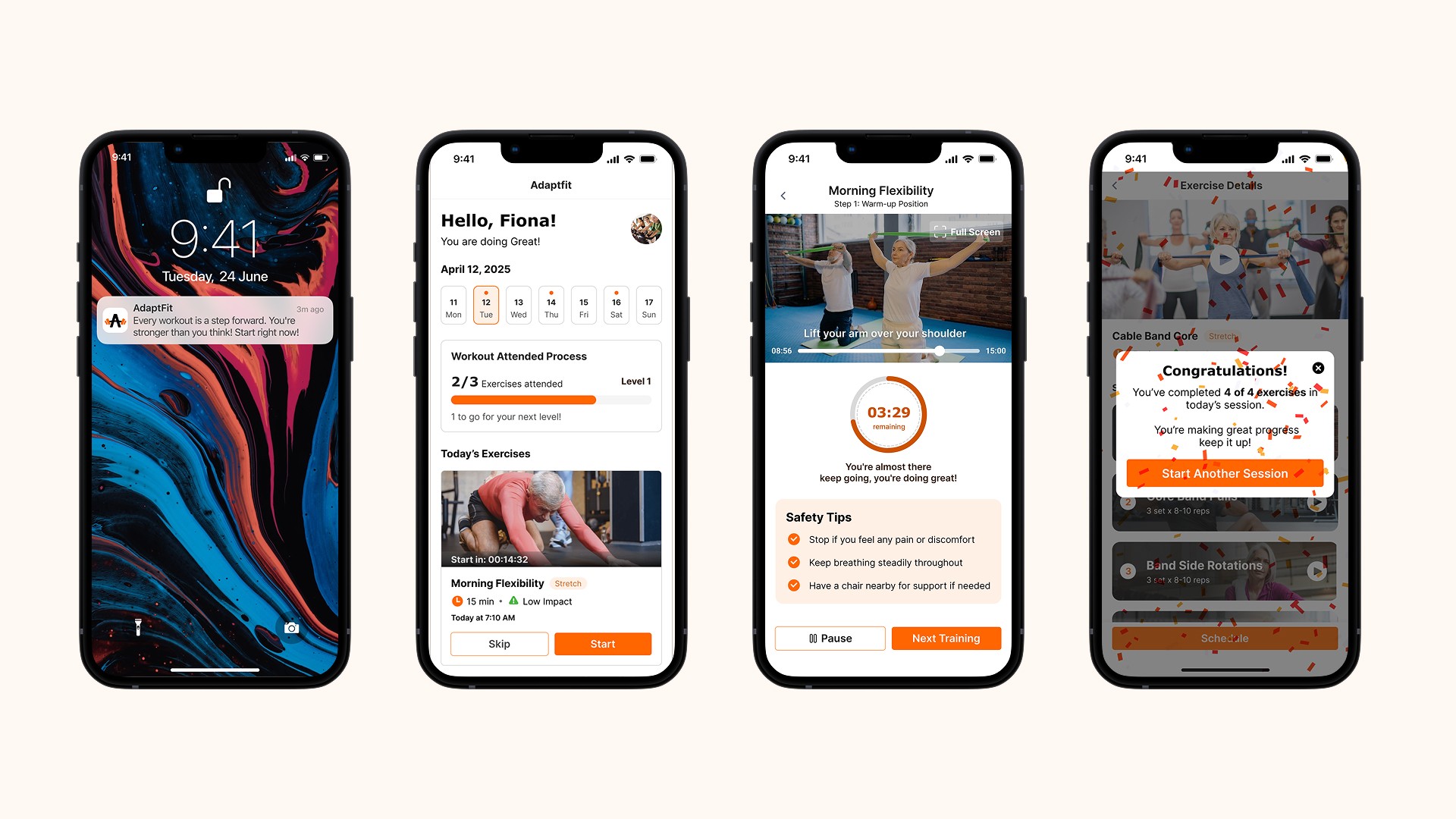 A mobile fitness application designed to support older adults in maintaining an active lifestyle. Adaptfit offers personalized low-impact workouts, guided video sessions, easy scheduling, and community features, all optimized for accessibility and simplicity.