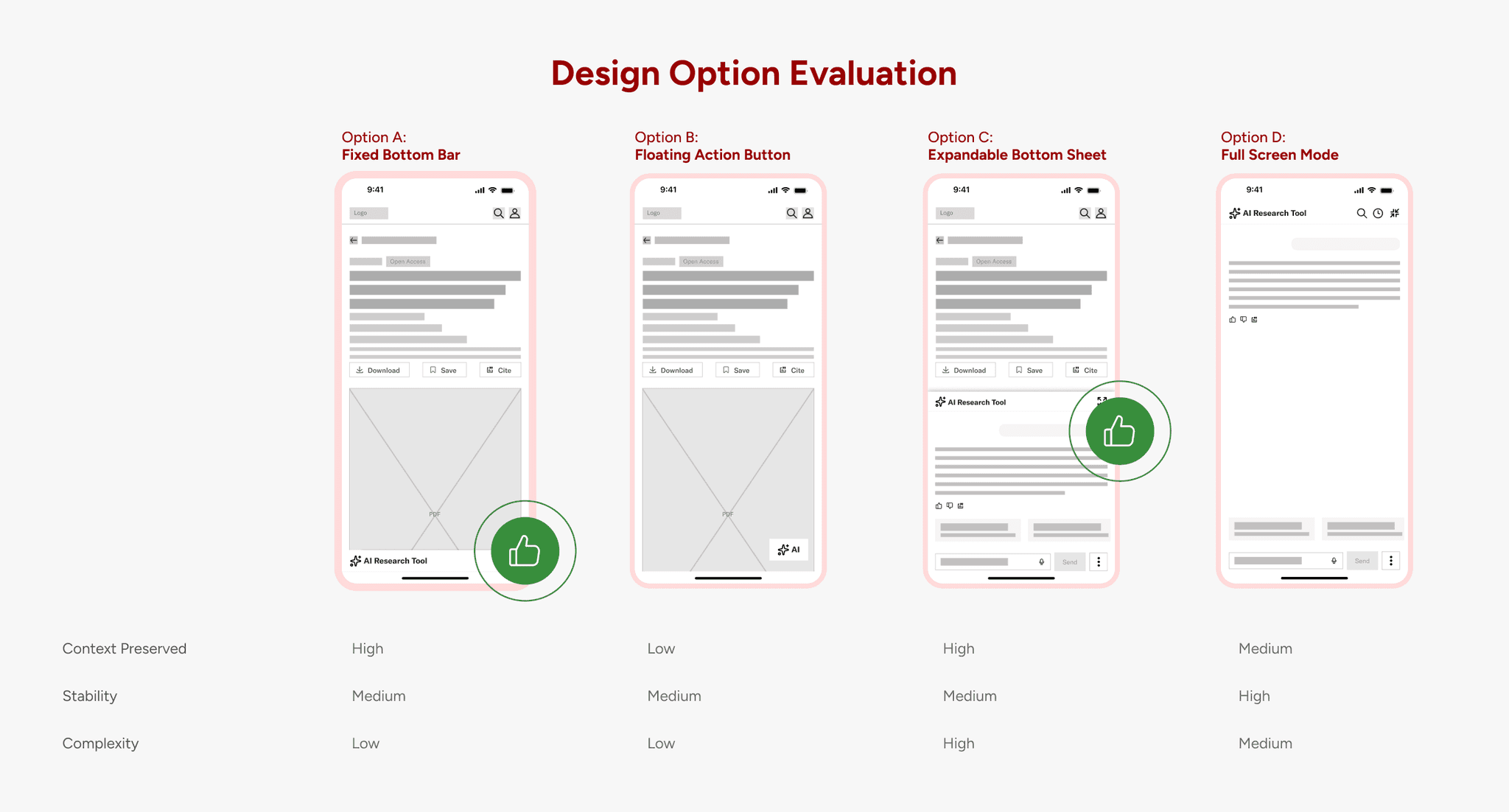 To solve the instability issue, we first diverged. Instead of immediately adjusting the existing layout, we explored multiple structural directions: persistent entry points, floating triggers, overlays, full-screen modes, and contextual embedding.