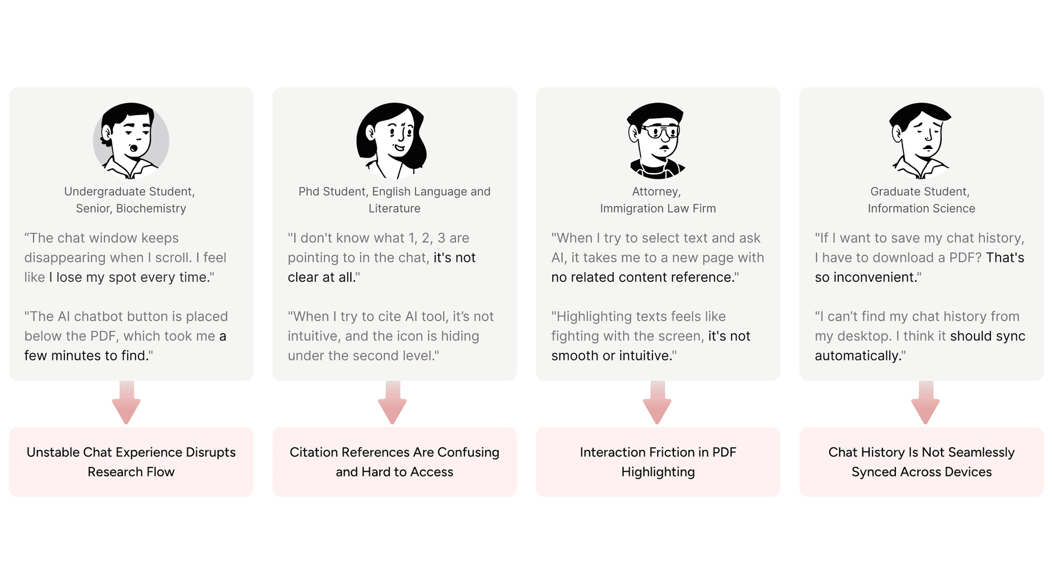 I conducted 10+ user interviews and usability testing to identify key friction points in chat stability, citation transparency, and cross-device continuity.
