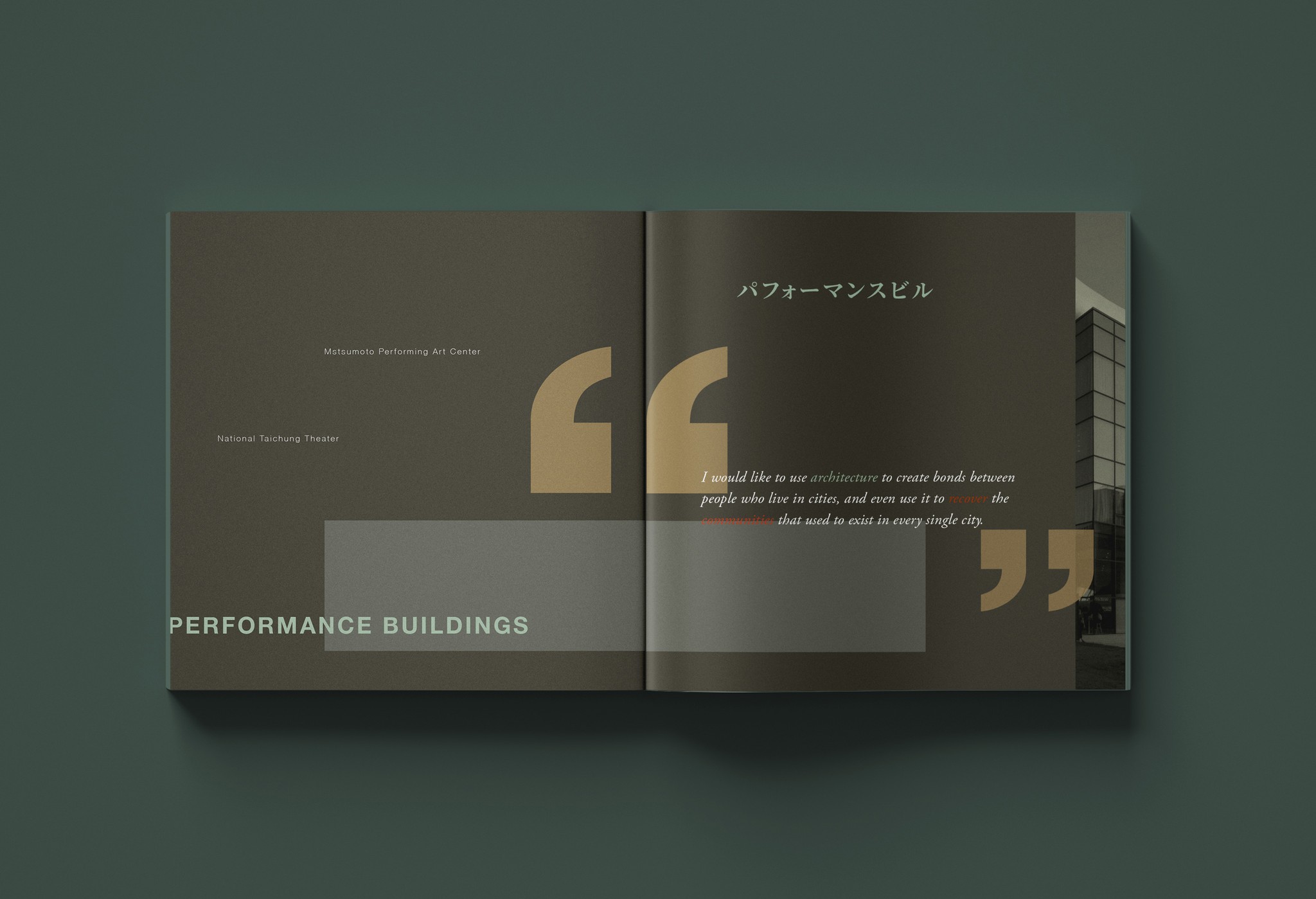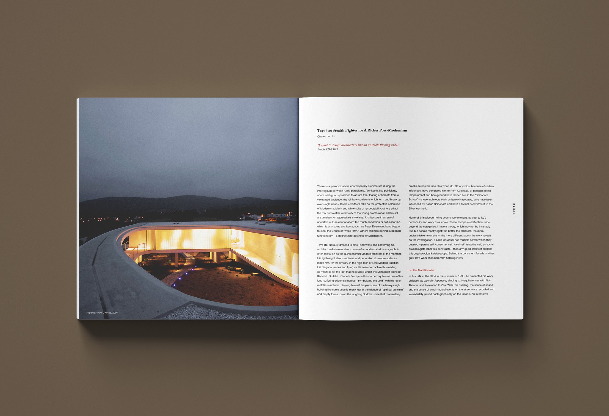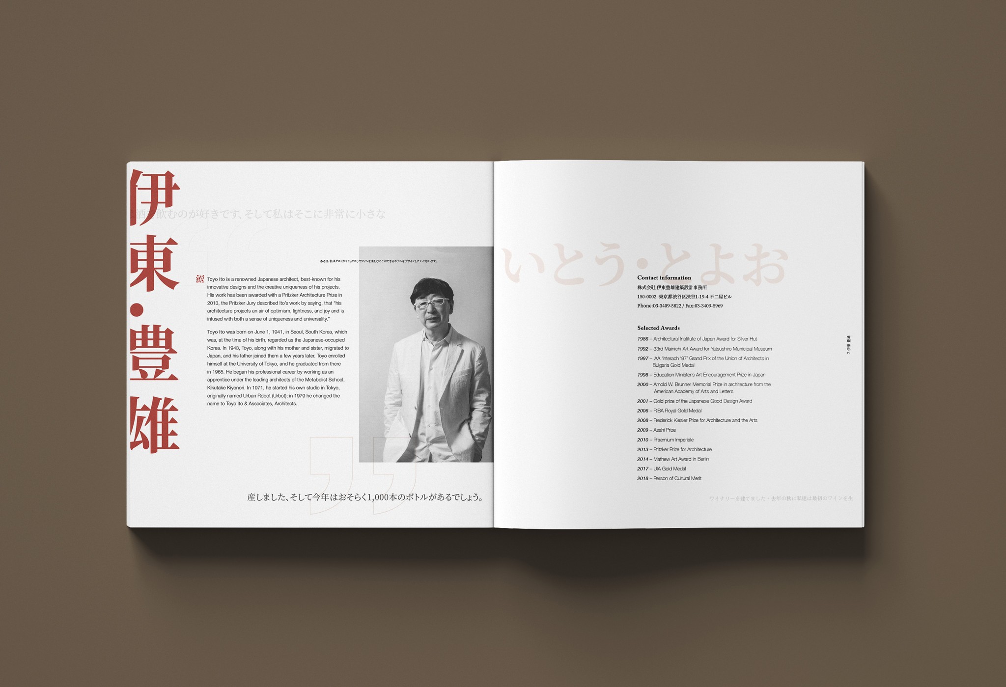 Toyo Ito is a Japanese architect known for creating conceptual architecture, in which he seeks to express the physical and virtual worlds. The seventy-six-page catalog consists of four chapters to show Toyo Ito's most iconic works. This catalog got inspiration from Japanese minimalism. The color palette was selected from traditional Japanese ceramics, which perfectly reflected the personality of his works.