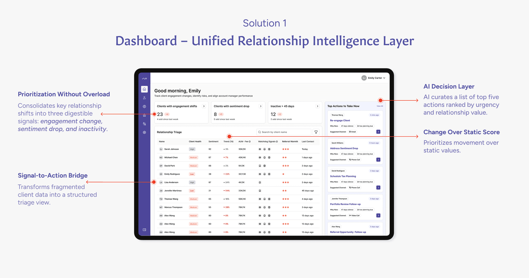 The primary challenge was not the lack of data, but the overwhelming volume of fragmented signals. Advisors were managing dozens of client relationships across multiple systems, yet struggled to quickly determine which relationships required attention.