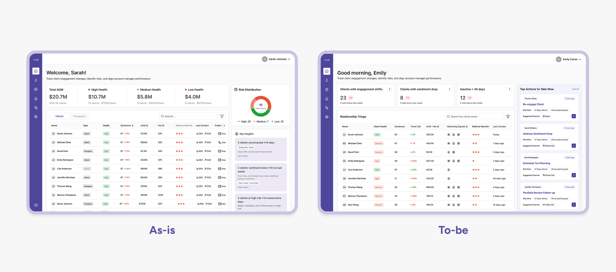To address this, I reframed the product from a “data dashboard” into a “relationship monitoring and prioritization engine.” Through behavioral research, workflow observation, and iterative prototyping, I introduced a triage-based system that surfaces changes, risks, and urgency signals in real time.