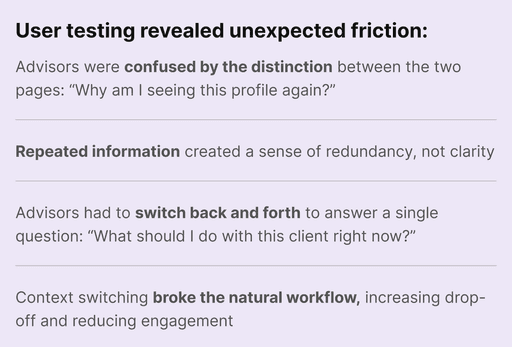 We hypothesized that placing too much information on a single page could increase cognitive load, making it harder for advisors to quickly locate the insights they need.