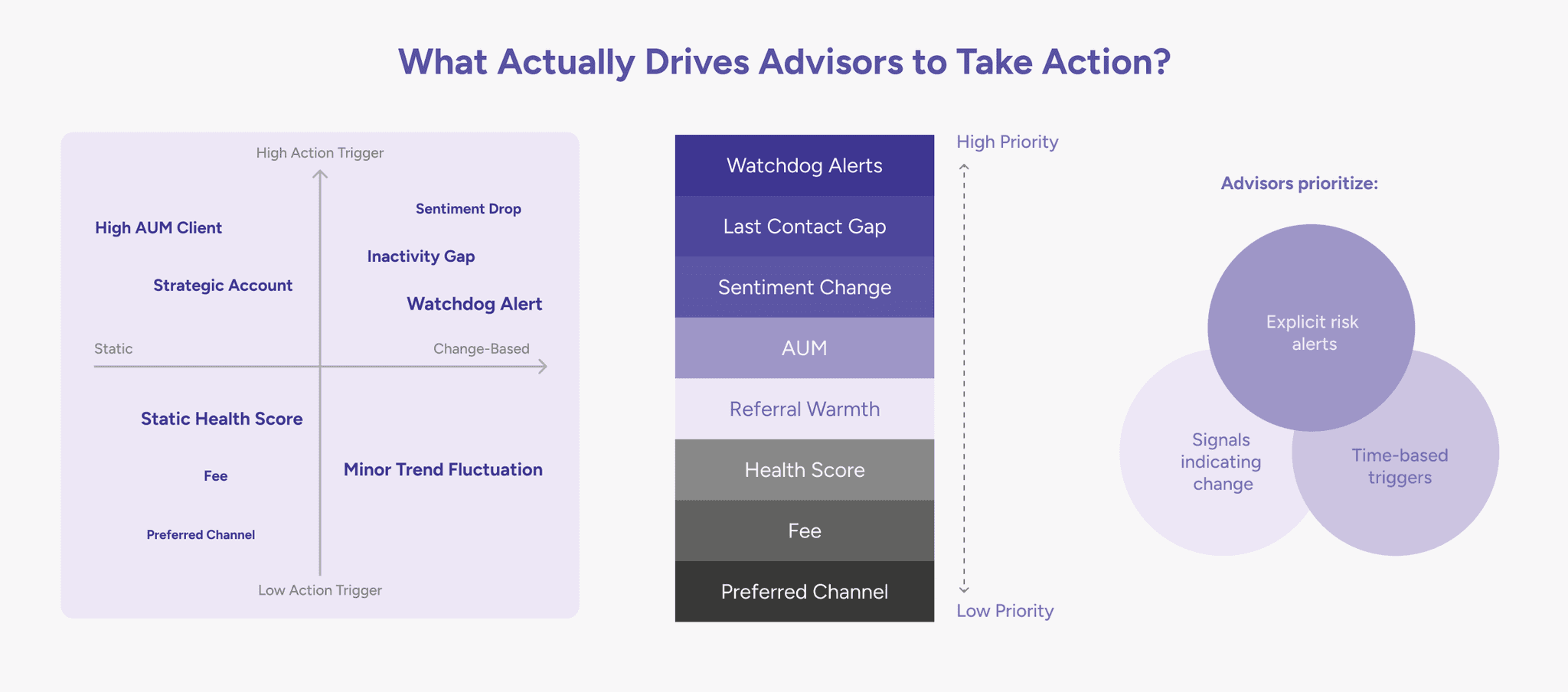 The original “Top Actions” module grouped alerts by category (Churn Risk, Opportunity, etc.), requiring advisors to interpret urgency themselves. I redesigned it around decision context instead of system taxonomy.