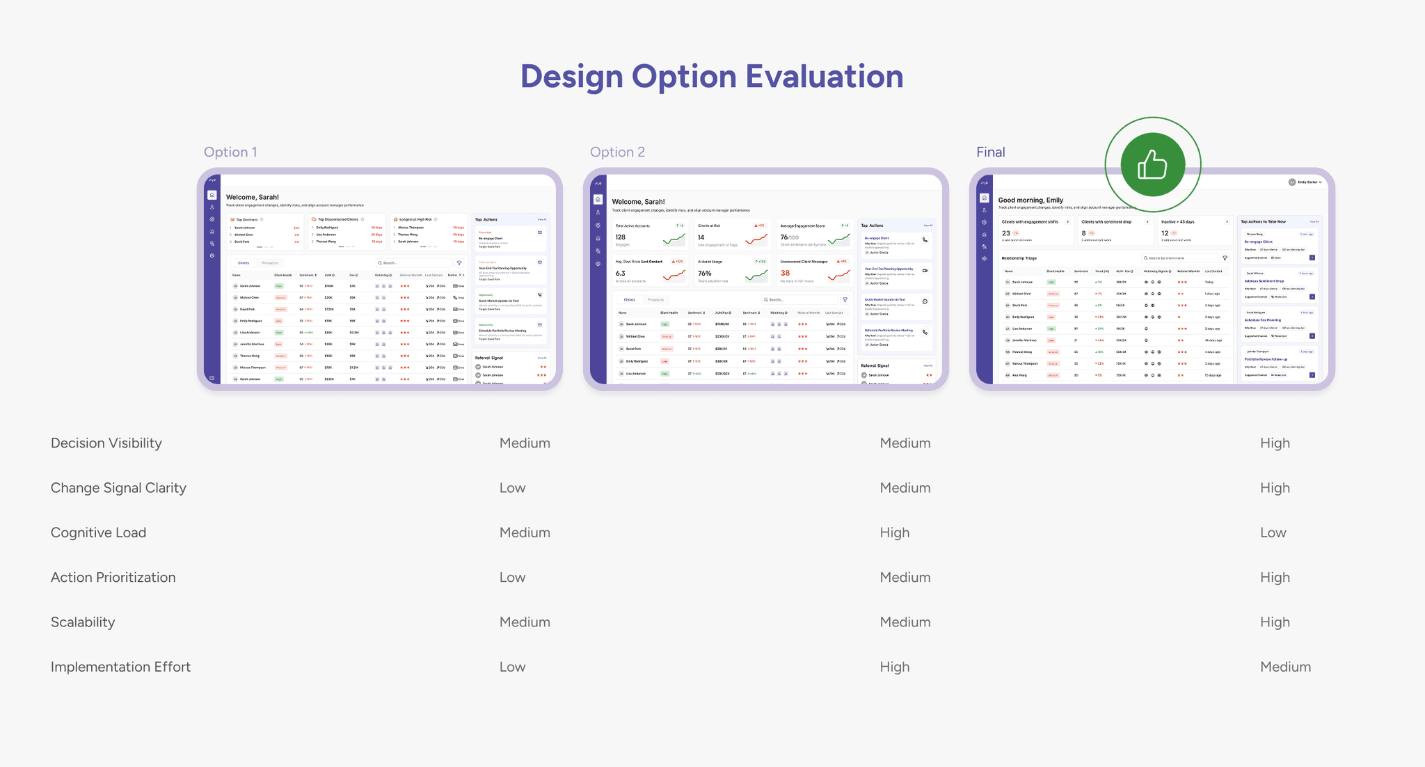 To redesign the dashboard effectively, I first focused on understanding what actually drives advisors’ decisions rather than assuming which data points were important