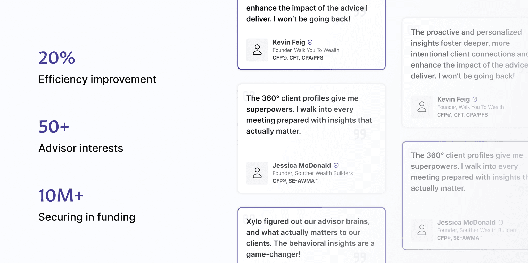 Beyond usability gains, the MVP attracted interest from 50+ financial advisors and supported the company in securing $10M in funding, reinforcing Xylo’s positioning as a relationship intelligence platform rather than a traditional CRM dashboard.