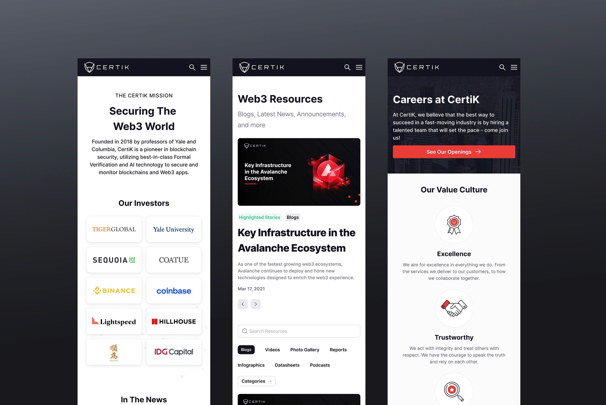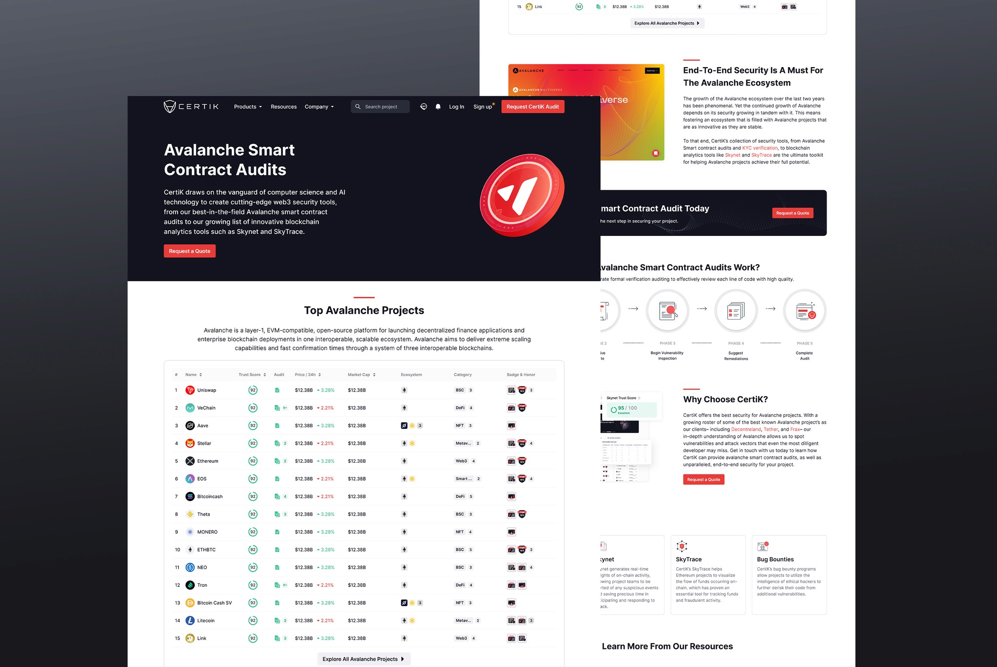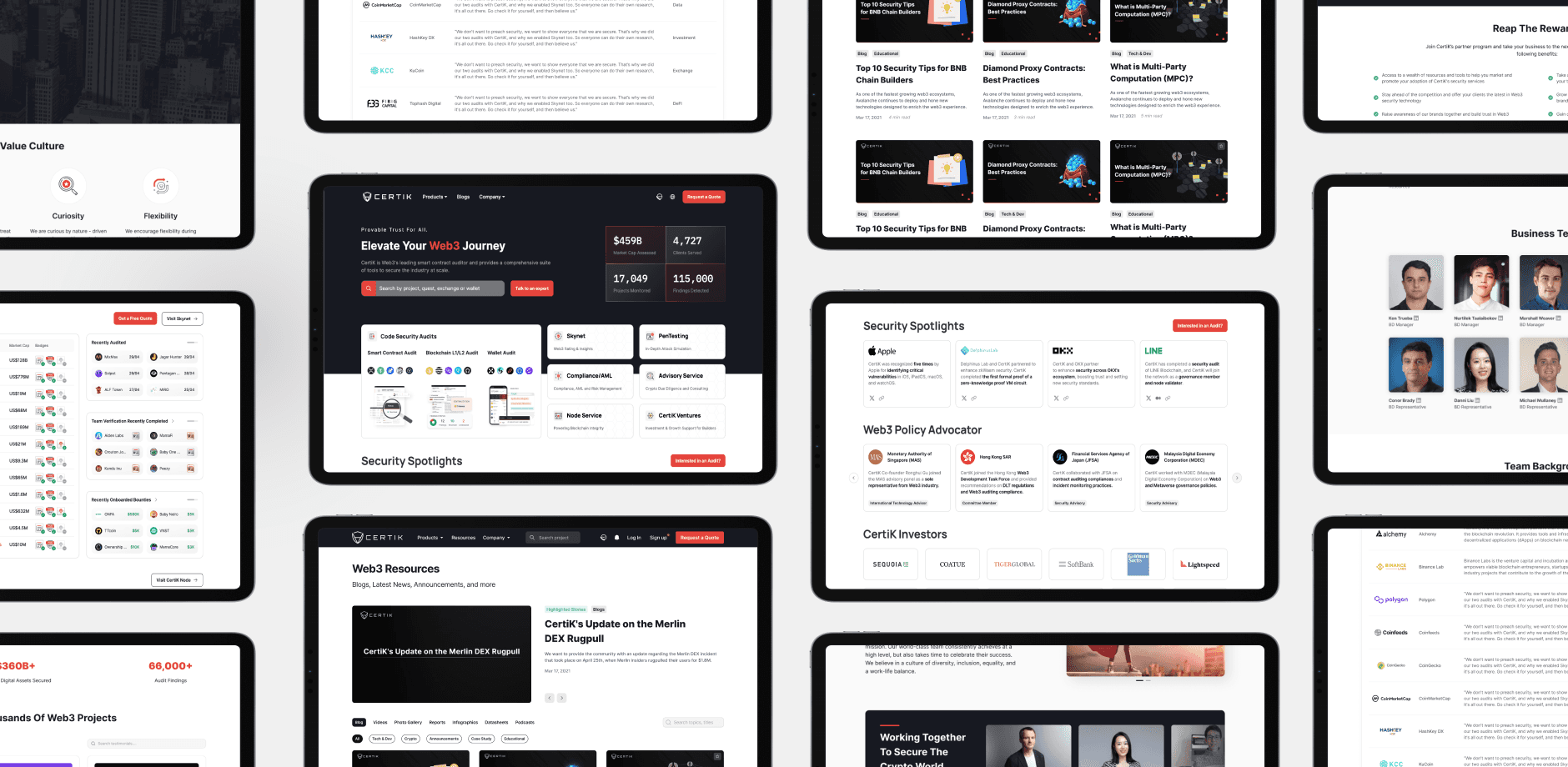I crafted a comprehensive visual system encompassing illustrations, icons, and infographics, effectively narrating Certik’s services and value proposition. Opting for a 1:10 ratio of red and black colors. I developed dedicated pages showcasing testimonials, partnerships, and support ecosystems. I incorporated universally recognized symbols like shields, locks, and interconnected nodes to enhance the perception of security and trust.